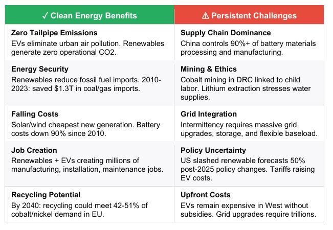 chains remain concentrated in China. Mining ethics are unresolved. Grids need